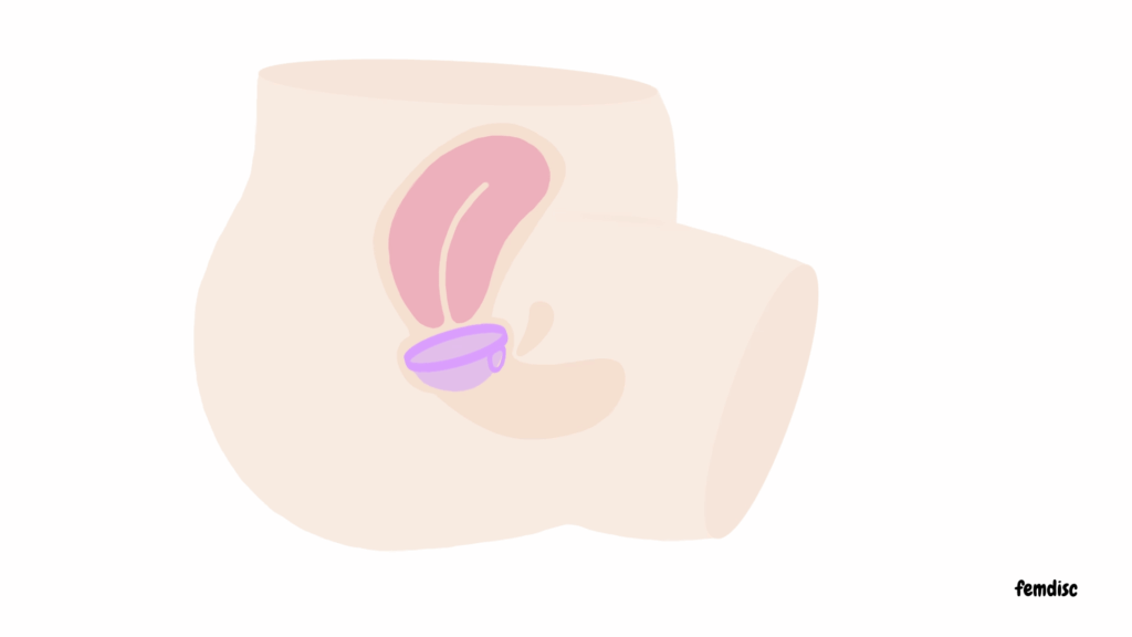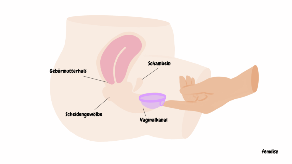 Sie sitzt bequem im Scheidensgewölbe am Ende des Vaginalkanals, direkt unter dem Gebärmutterhals und sammelt dort das Menstruationsblut.